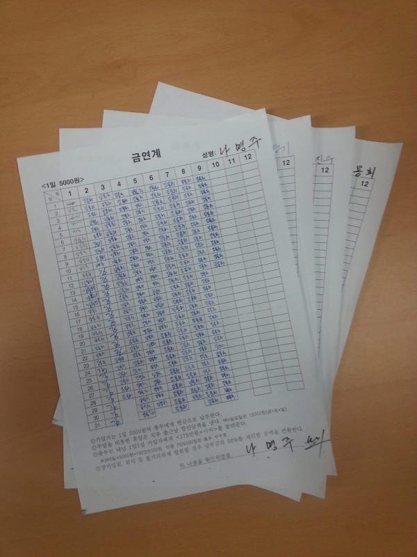 시작은 순조로웠다. 규칙 등이 적힌 곗돈 납부 확인서를 만들어 서명을 했고 금연으로 아낀 돈은 꼬박꼬박 적금통장에 모았다. 김용희 기자는 "한 두달만 하고 그만 두려했는데 선배들의 의지가 대단해 중간 탈퇴란 상상조차 할 수 없었다"고 회상했다.