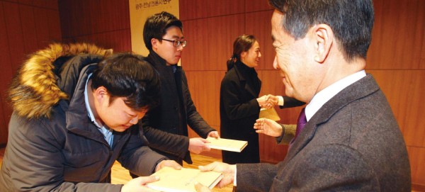 <사진설명> 선배 언론인들이 광주전남언론사를 후배 기자들에게 전달하고 있다.