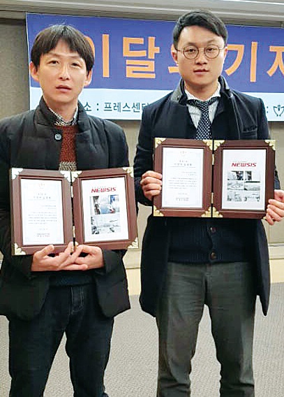 뉴시스 광주전남본부 배동민(왼쪽)·신대희 기자가 지난달 28일 한국프레스센터 19층 기자회견장에서 '37년 만에 밝혀진 계엄군의 5·18 헬기사격' 보도로 한국기자협회(회장정규성) 제317회 '이달의 기자상' 지역 취재보도 부문을 수상했다.