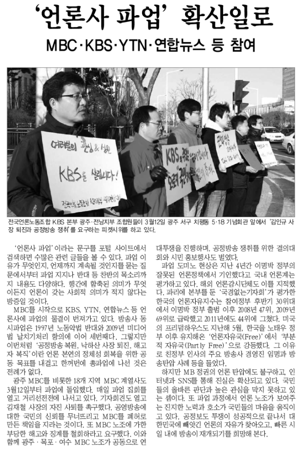 '언론사 파업' 확산일로 게시글 작성정보 작성자 광주전남기자협회 작성일 13-02-04 18:41 조회수 4,962 댓글수 0 목록 게시글 본문 '언론사 파업' 확산일로 MBC KBS YTN 연합뉴스 등 참여 첨부파일 1개 사회7.png (373.6K) 0회 다운로드 첨부일시 : 2013-02-04 18:41:41 이전글 한국언론재단 교육프로그램 지상중계 13-03-19 다음글 광주·전남기자협회 사회공헌 캠페인 협약 13-02-04 댓글 0 등록된 댓글이 없습니다. 목록