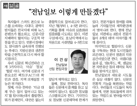 전남 일보 이렇게 만들겠다 게시글 작성정보 작성자 광주전남기자협회 작성일 13-02-04 18:08 조회수 5,164 댓글수 0 목록 게시글 본문 전남 일보 이렇게 만들겠다 첨부파일 1개 이미지 11.png (74.4K) 0회 다운로드 첨부일시 : 2013-02-04 18:08:18 이전글 저널리즘으로 돌아가자 13-02-04 다음글 광남 일보 새 경영진 취임 13-02-04 댓글 0 등록된 댓글이 없습니다. 목록