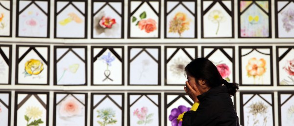 세월호 희생자의 꽃 영정 304개가 무대에 놓여지자 한 시민이 눈물을 흘리고 있다.