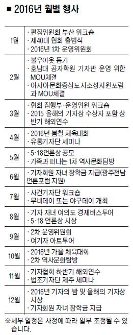 장학금 수혜 폭을 대폭 늘릴 방침이다. 광주전남언론포럼 지원을 받아 지급하고 있는 장학금 외에 기자협회 차원의 장학금을 별도로 조성해 연말 기자의 밤 행사 때 지급할 계획이다. 여기자 아트투어를 신설하고 무비데이나 야구데이 개최도 검토하겠다.