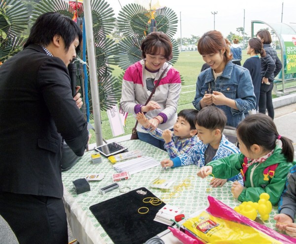 전문 마술사가 진행하는 마술 체험에 참가한 어린이들과 가족이 신기한 듯