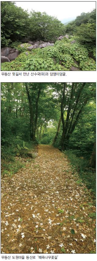 규봉암에서 출발지점으로 내려가는 길(1.7㎞)은 제법 경사가 있다. 길가엔 드문드문 나리꽃이 피어있다. 도원마을에서 출발해 다시 제자리로 돌아오는 동안(장불재~규봉암 구간은 제외) 아무도 마주치지 않을 정도로 아직 등산객의 발길이 드문 곳이다. 그래서 번잡한 등산로를 벗어나 도란도란 얘기를 나누며, 쉬엄쉬엄 오르는 길을 찾는다면 권할만한 길이다.