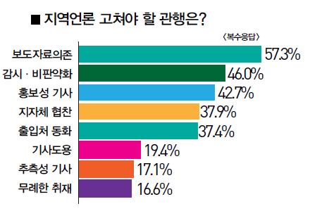 '지역 언론이 고쳐야할 관행'을 묻는 질문(복수응답)에서는 46.9%가 '보도자료 의존'이라고 답했다. 홍보성 기사 작성이 11.4%로 뒤를 이었다. 이밖에도 △기사 도용(10.9%) △ 감시ㆍ비판기능 약화(9.5%) △출입처 동화(9.0%) △무례한 취재(6.6%) △지자체 협찬(3.8%) 등을 개선해야 할 관행으로 지적했다.