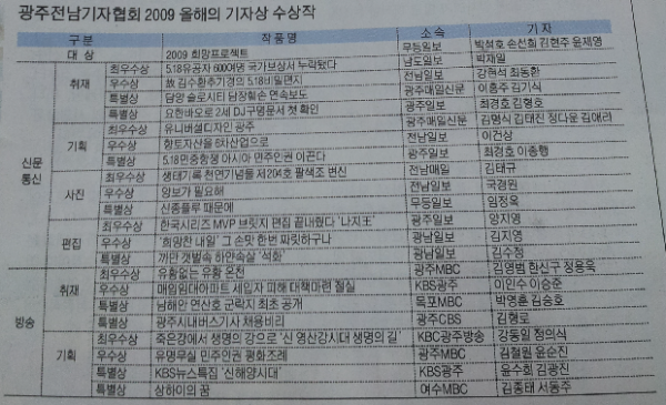 광주전남기자협회는 지난 10일 2009광주전남올해의 기자상 심사를 갖고 심사결과를 14일 발표했다.