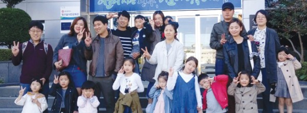 주최한 미디어아트 체험행사에 참가한 회원 가족들이 기념사진을 찍고 있다.