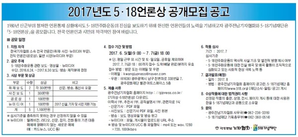 [5·18 언론상] 2017 5.18언론상 공모 안내 게시글 작성정보 작성자 광주전남기자협회 작성일 17-04-12 17:03 조회수 2,521 댓글수 0 목록 게시글 본문 2017 5.18언론상 공모 안내 첨부파일 1개 언론상.jpg (227.9K) 0회 다운로드 첨부일시 : 2017-04-12 17:03:48 이전글 열심히 쉬었나요…상품 받아가세요 휴가기·휴가사진 공모 17-07-17 다음글 2016년 광주전남기자협회 올해의 기자상 공모 안내 16-11-16 댓글 0 등록된 댓글이 없습니다. 목록