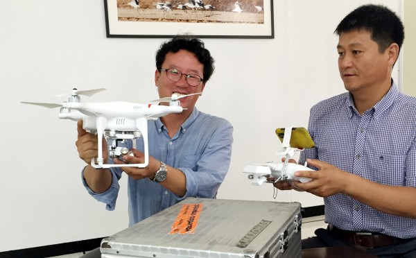 드론 장비를 점검하고 있다.