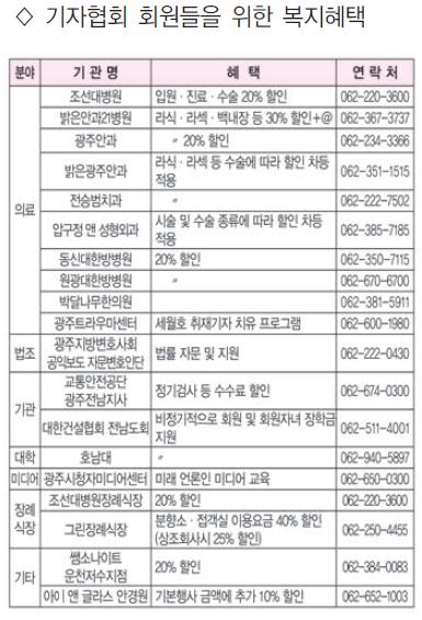 기자들의 건강을 위해 의료서비스 지원에 나선 의료기관도 있다. 조선대병원은 회원들에게 입원, 진료비를 20% 할인해 준다. 수술비도 종류에 따라 할인 혜택을 제공한다.