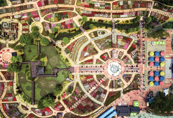 정원을 산책하고 있다. 하늘에서 본 정원의 모습이 오밀조밀 미로처럼 뻗어 있다.