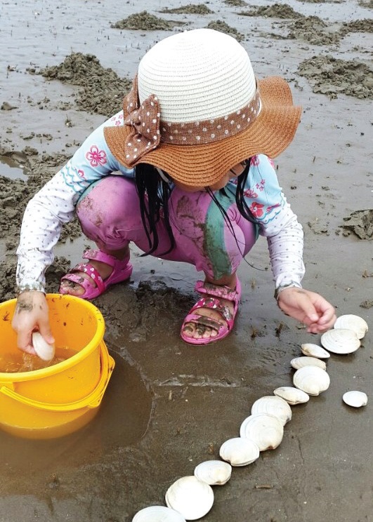 맨발로 갯벌을 밟았을 때 발가락부터 정수리까지 쫙 펼쳐지는 시원함이 더위에 지친 몸을 달랜다.그리고 우리 딸이 조개 구멍을 찾는다. 떡조개와 백합도 숨을 쉬기 위해 갯벌에 조그마한 구멍을 만든다.