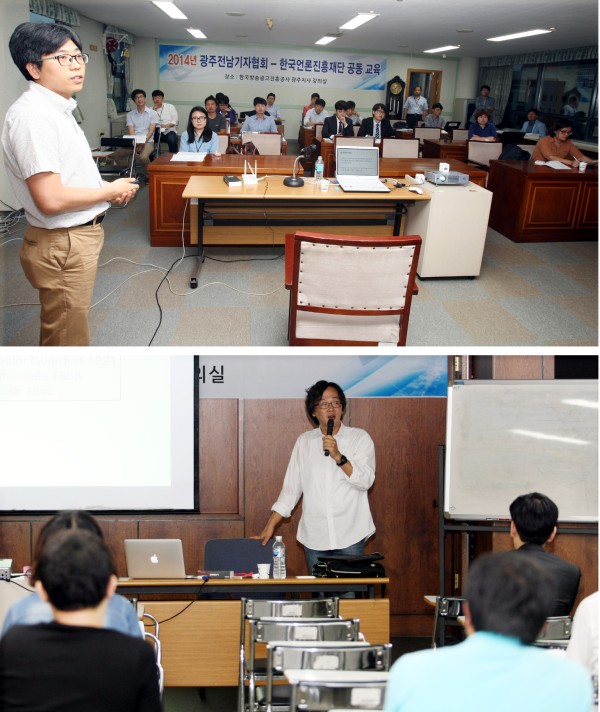 지난달 25일 오후 광주전남기자협회와 한국언론진흥재단이 공동으로 마련한 언론인 교육에서 기자 30여명에게 질문이 던져졌다. 광주에서 기자협회 주최로 언론재단 기자 재교육이 실시된 것은 이번이 처음이다.